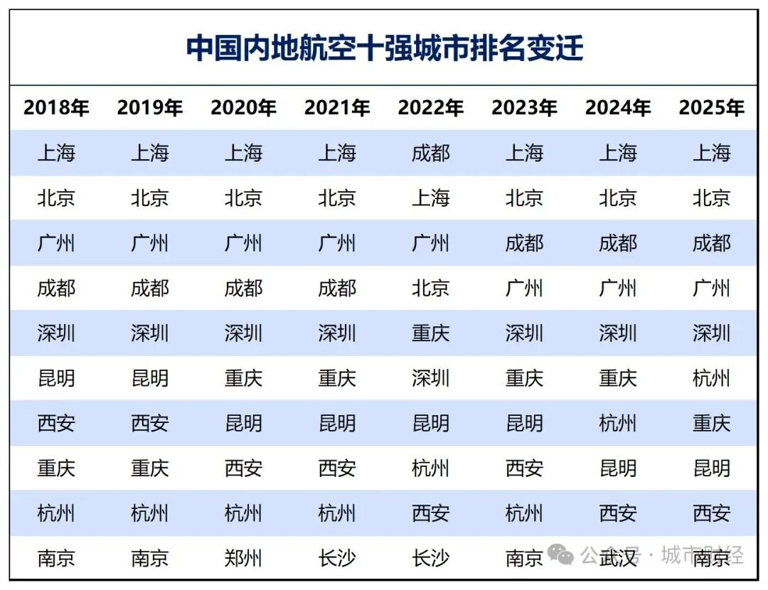 成都反超广州,跻身前三;重庆、深圳、杭州围绕“航空第五城”展开角逐;西安、昆明排名有所下滑;武汉、南京争夺十强席位。