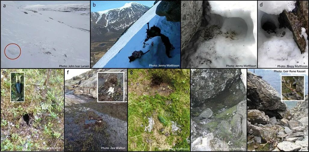 狼獾对储存点还有严格的标准,它喜欢的地方有雪洞里、大石头的缝隙间,还有沼泽里(会挖个洞把食物埋住),偶尔会放在森林里的苔藓底下。这些低温、黑暗和隐蔽的地方,可以作为天然“冰箱”,延缓腐烂,并防止“小偷”,比如乌鸦、雕、赤狐,还有其他狼獾找上门来。