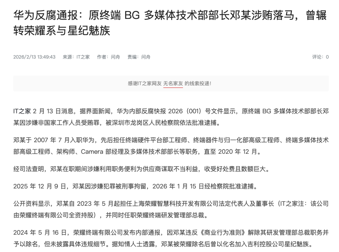 如今,这些高管基本大多已经离开,但其中值得一提的是,有知情人士向界面新闻透露,2024年8月,邓斌(化名陈晨)经由苏静引荐入职星纪魅族,负责手机业务。而这位邓斌,就是此前被媒体报道的那位“原华为BG多媒体技术部部长,原荣耀研发管理部总裁邓斌”,其涉嫌非国家工作人员受贿罪被依法逮捕,数额巨大。而邓斌从荣耀离职的原因,也是因为违反公司《商业行为准则》问题被最终除名。