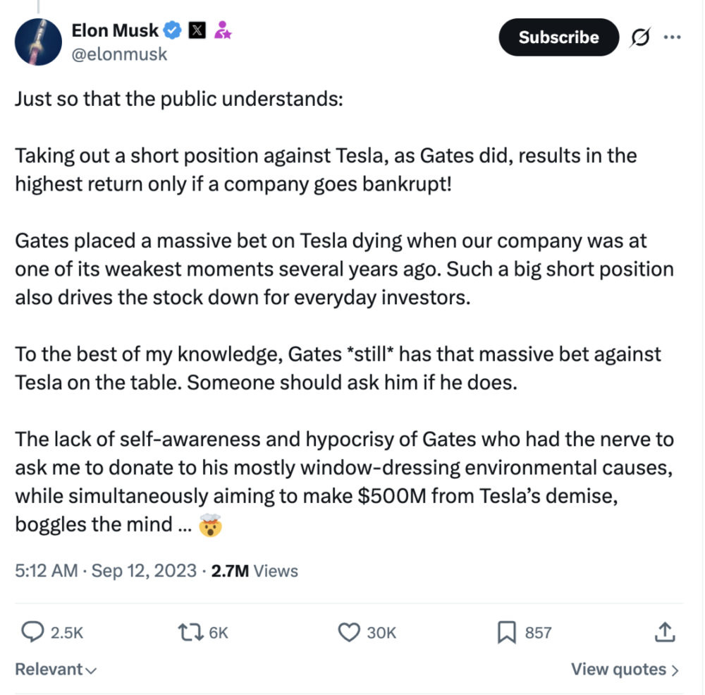 2023年9月,马斯克曾说:“像盖茨那样做空特斯拉,只有在公司破产的情况下才能获得最高回报……几年前,在我们公司最艰难的时期之一,盖茨却押注特斯拉会倒闭。如此巨大的空头头寸也会拉低普通投资者的股价。”
