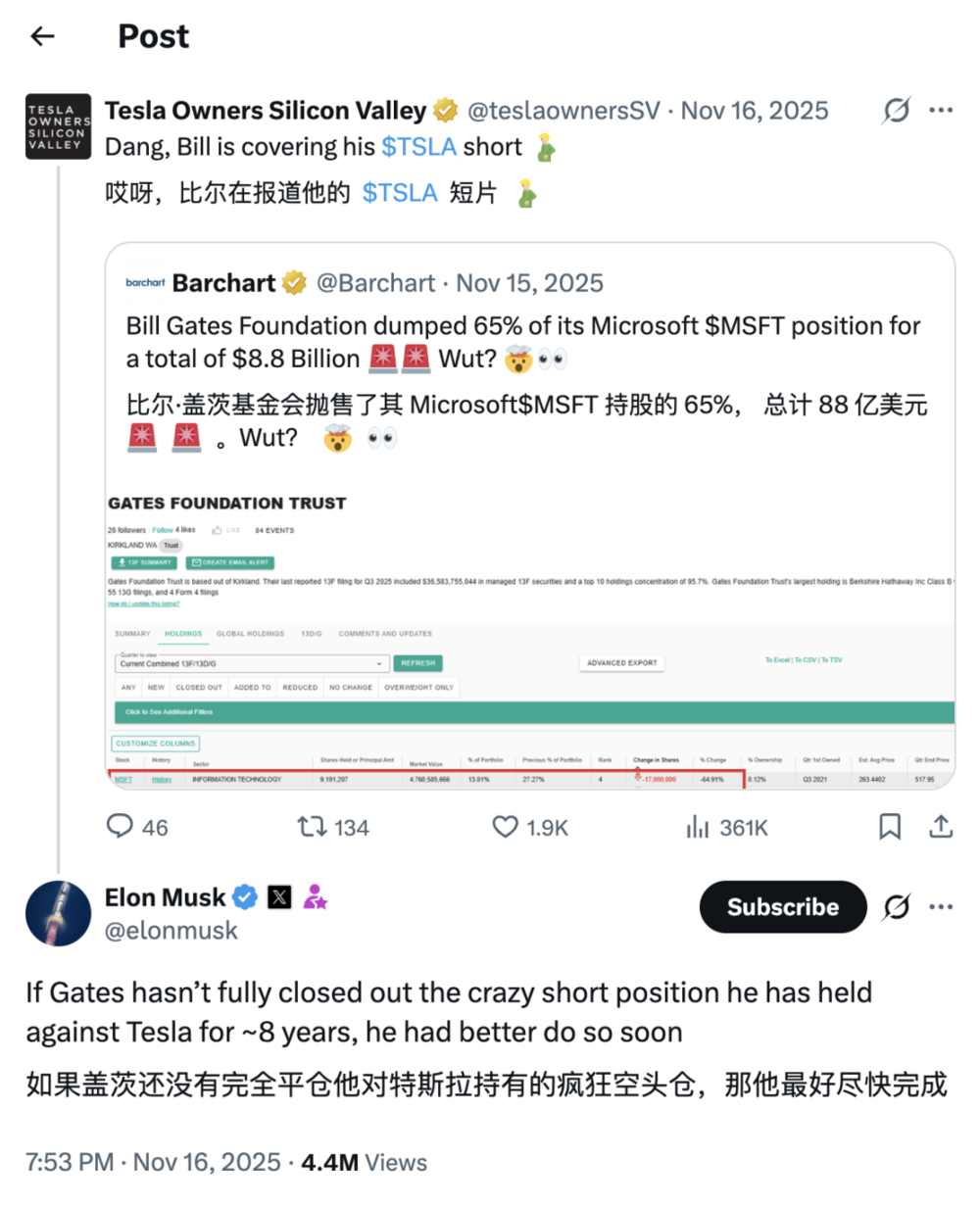 2025年11月,马斯克1万亿美元的薪酬方案获得股东批准后,他再次发文,语气中带着一丝幸灾乐祸:“如果盖茨还没有完全平仓他持有近8年的特斯拉疯狂空头头寸,他最好尽快平仓。”