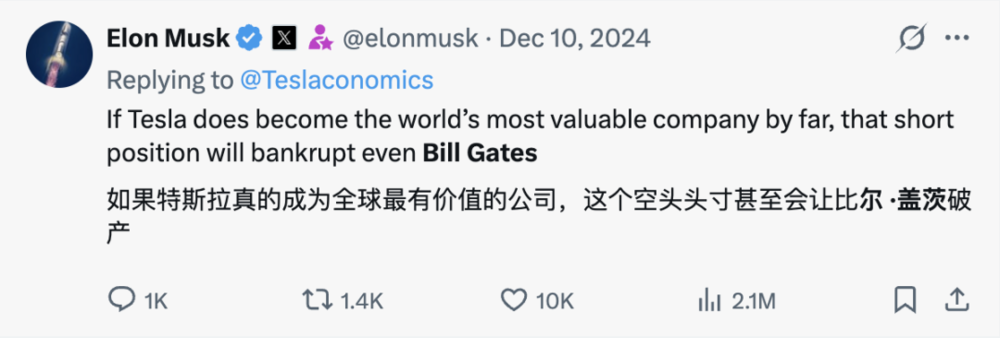 他在X上发帖称:“如果特斯拉真的成为全球最有价值的公司,这个做空头寸甚至会让比尔·盖茨破产。”