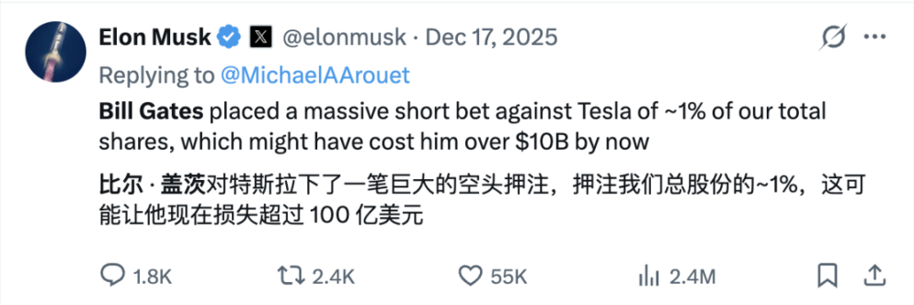 2025年12月,马斯克旧事重提,称盖茨可能已经因做空特斯拉损失100亿美元。