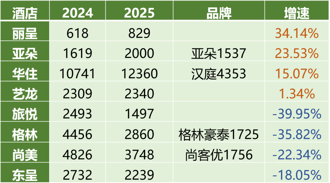 然而,格林、东呈、尚美、旅悦旗下的酒店数量却在2025年集体收缩(以APP上可以订购酒店数量统计),形成鲜明对比。首先是旅悦,在营门店数量同比下降39.95%至1497家;其次是格林,由原本4456下降至2860,同比下降35.82%,其中有1725家格林豪泰;然后是尚美,在营门店数量同比下降22.34%至3748,其中有1756家尚客优;最后是东呈,门店数量同比下降18.05%至2239家。