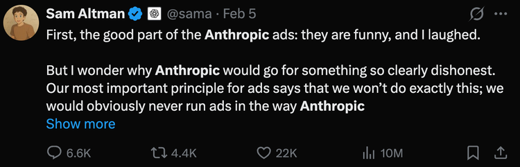2026年超级碗,Anthropic投放讽刺广告嘲讽ChatGPT即将加入广告,Sam Altman当晚就在X上反击称其不诚实。这场隔空对线在X上引发了超过15万条ChatGPT相关讨论和6.9万条Claude相关讨论。两家公司的产品竞争,在X上升级成了一场公共事件。