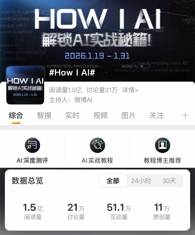 这个变化值得拆开来看。2025年DeepSeek爆火的时候,微博上的AI内容主要是新闻和热点讨论,某某公司发布了某某模型,股价涨了多少,大家围观一下就过去了。