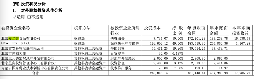 此外,三元股份的利润结构也同样依赖“外援”。据三元股份2025年半年报,其持有北京麦当劳食品有限公司50%的股份,这一部分的投资为其带来了年内1.65亿元的收益,而同期,三元股份利润总额为1.85亿元。