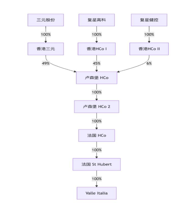 为了完成收购,三元搭建了复杂的多层境外持股架构。首先,是在香港设立全资子公司香港三元,与复星系旗下主体共同出资在卢森堡成立合资公司卢森堡HCo,双方持股比例固定为49:51。其后,再由卢森堡HCo通过全资子公司法国HCo作为收购主体,以6.26亿欧元(约合50.7亿元人民币)的总对价,拿下法国百年植物涂抹酱企业St Hubert及其意大利销售子公司Valle’Italia的100%股权,2018年1月正式完成交割。