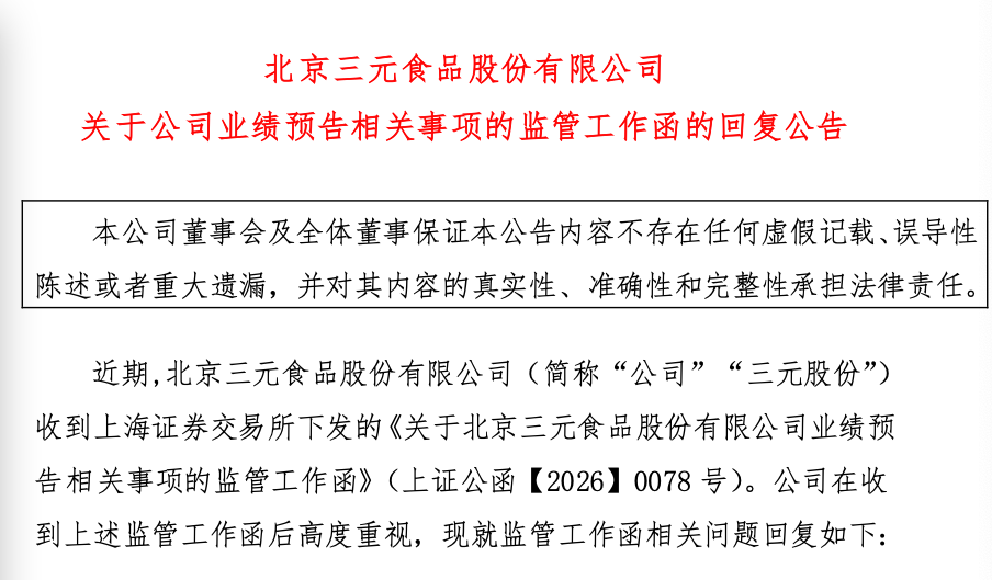 业绩“由盈转亏”的变脸情况,触发了监管关注。日前,三元股份发布公告,确认收到上海证券交易所下发的《关于北京三元食品股份有限公司业绩预告相关事项的监管工作函》(下称:《监管工作函》)。