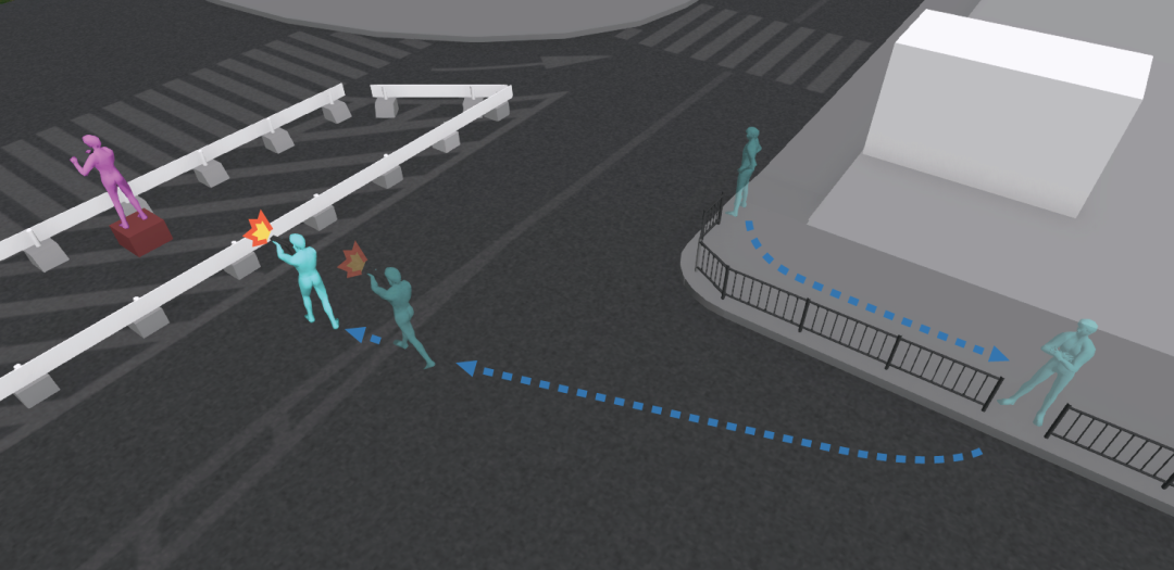 日本媒体模拟的枪杀现场,安倍晋三(紫色)和山上彻也(绿色)位置关系