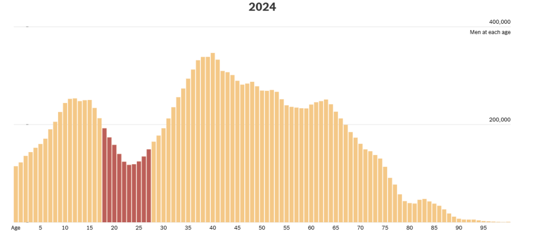 2024年乌克兰人口各年龄层分布,可以看到18-27岁群体人数出现明显断层。资料来源:联合国《世界人口前景》,年龄估算数据基于联合国2022年的模型分析得出,其中包括对当前战争期间死亡事件和大规模移民情况的粗略估计。图片来源:纽约时报