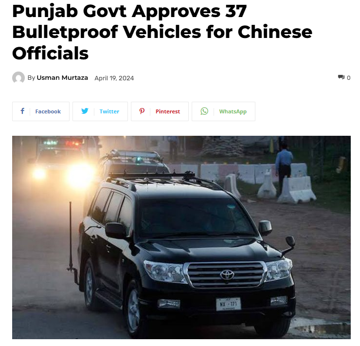 巴媒2024年报道:旁遮普省政府决定采购37辆防弹车,以加强在包括中巴经济走廊相关项目在内的各类工程中工作的中国工程师和官员的安全。