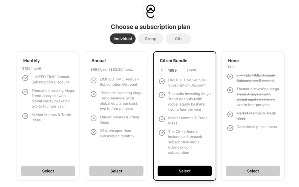 这让吉伦一战成名,迅速在金融圈建立起声誉。随后,他在内容付费平台Stustack上创立了自己的投资分析品牌Citrini Research,吸引了大量订阅者。
