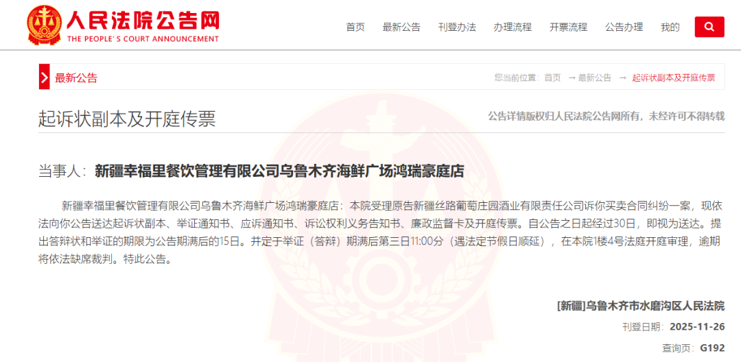 近日,乌鲁木齐市水磨沟区人民法院发布开庭传票公告,一起因买卖合同纠纷引发的诉讼进入司法程序。原告为新疆丝路葡萄庄园酒业有限责任公司,被告则为新疆幸福里餐饮管理有限公司乌鲁木齐海鲜广场鸿瑞豪庭店。
