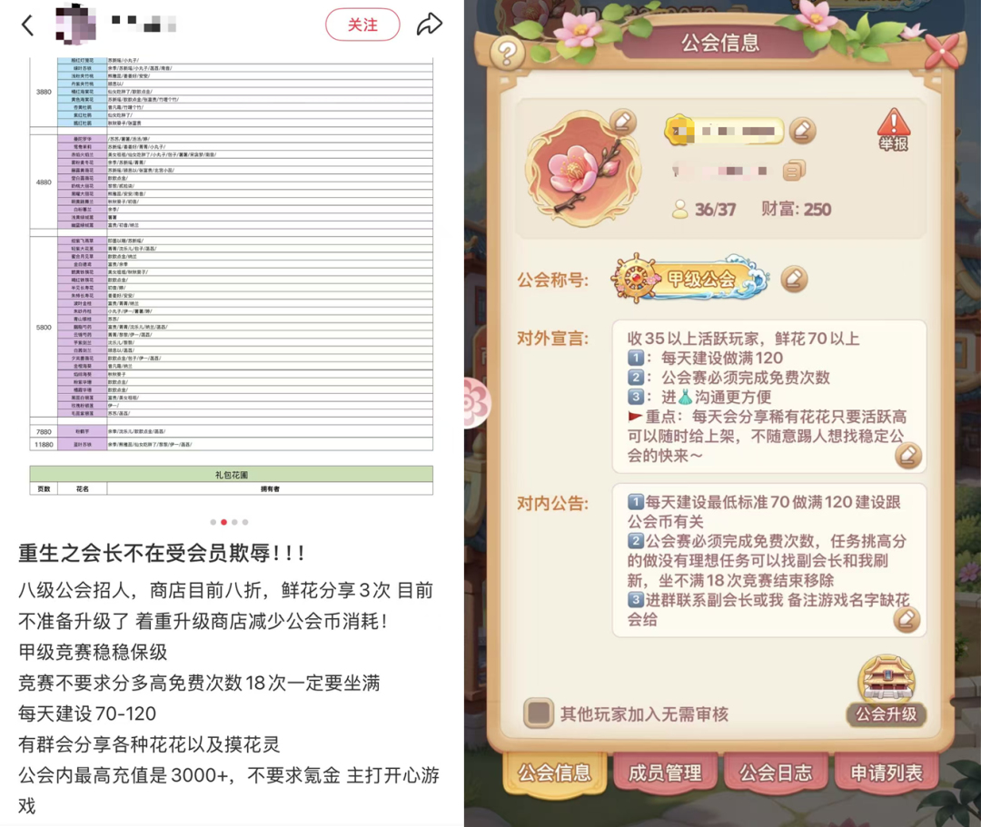 也不全是。基于游戏的“偷花”玩法,玩家可以去好友的花地里偷花,或者在公会里获得其他玩家分享的鲜花。因此,不少玩家也会把《我的花园世界》比作披着种田外衣的SLG——大哥(姐)带着一群小弟(妹)玩游戏。