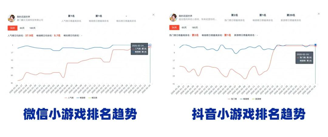 先看它的离谱成绩。在小游戏方面,自除夕开始,《我的花园世界》就冲上了微信和抖音小游戏双平台的畅销榜第一,并在春节期间持续霸榜。