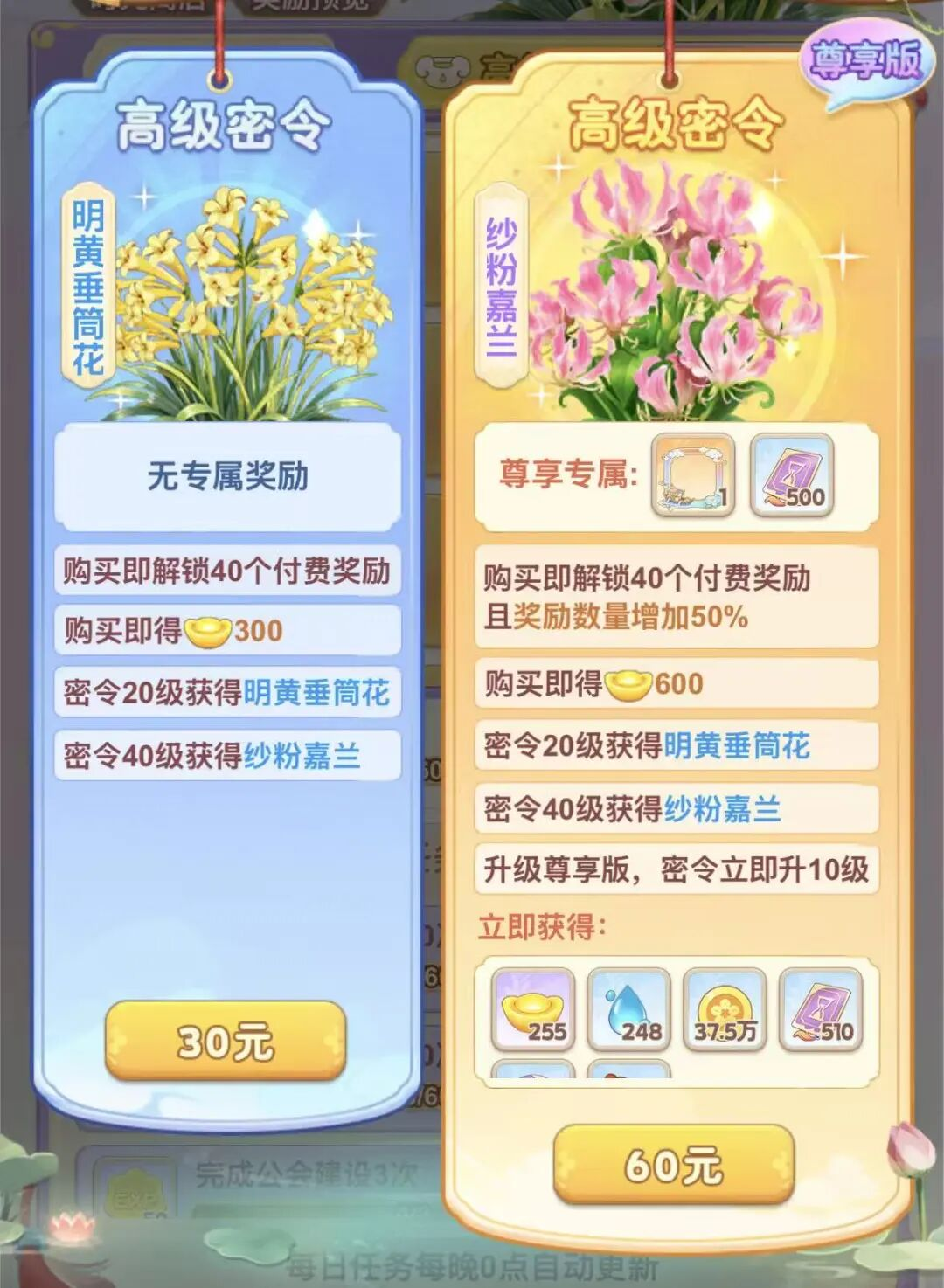 做到这一步,还不算完。就算你终于整出了花灵,每天能产出的月亮币还是有上限的,而且这个上限较低,想到你前面已经投入了这么多钱和功夫,这点月亮币显然有点不够玩,于是你又要开通花之密令,相当于通行证,这样才能提高月亮币产出上限,提高养成效率。