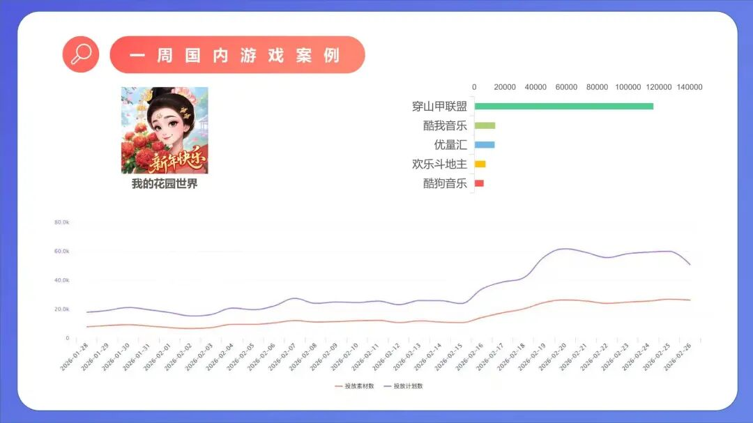 而在春节期间,他们又加大了营销力度。不仅放大了线下领真花的噱头,还找来杨紫代言,进一步打开声量。据DataEye统计,《我的花园世界》从2月14日情人节开始增加买量投放,并登顶了中重度手游周投素材榜。