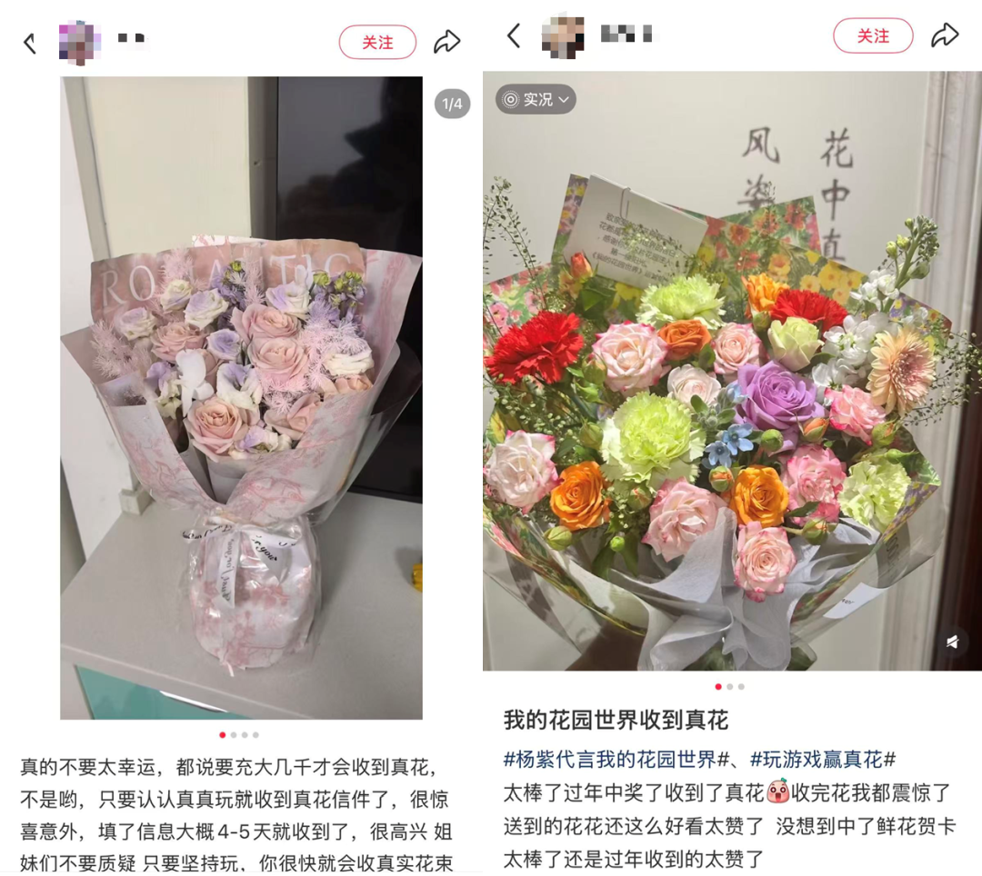 鲜花对于女性用户的吸引力是货真价实的,加上薅羊毛心理,游戏很快得到了广泛传播,去年小红书上已经有大量用户分享自己收到的真花。