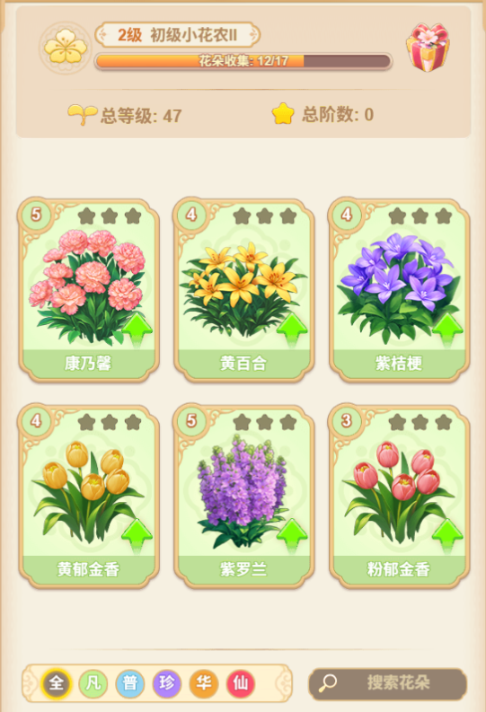 想要获得花灵,你还需要副花与精灵花(主花)搭配种植,而副花又分为不同品质,其中橙色与紫色品质的礼包需要氪金购买。