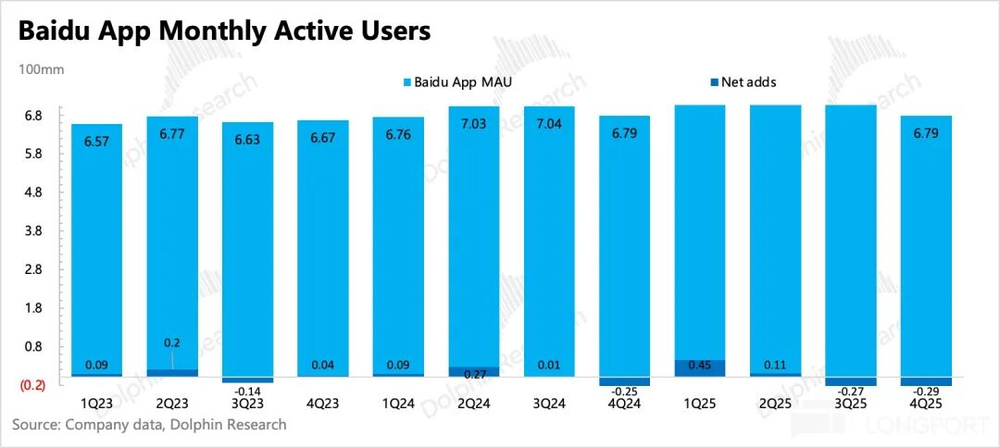 海豚君倾向于传统广告还在底部挣扎,毕竟百度传统广告受到宏观环境、行业内外竞争的影响。四季度手百用户继续流失,MAU滑落至6.79亿。尽管有季节性影响,但连续两个季度持续下降,很难回避同行竞争的影响,尤其是新生代的AI Chatbot。