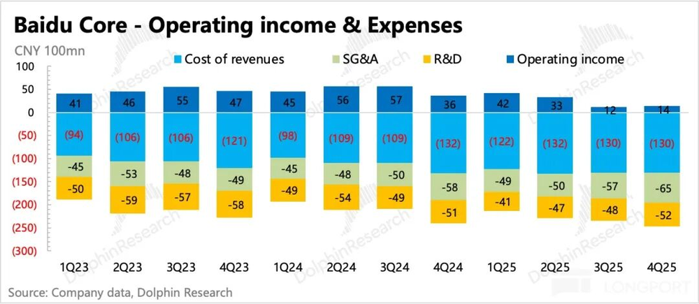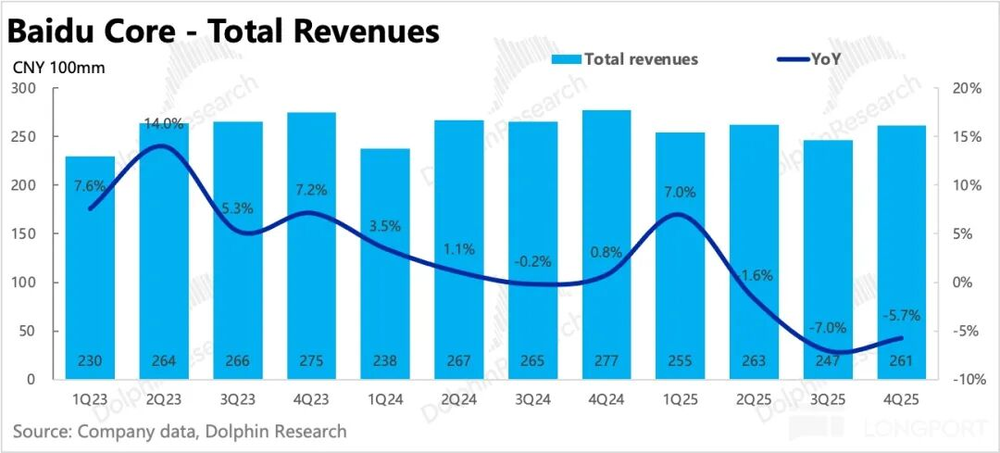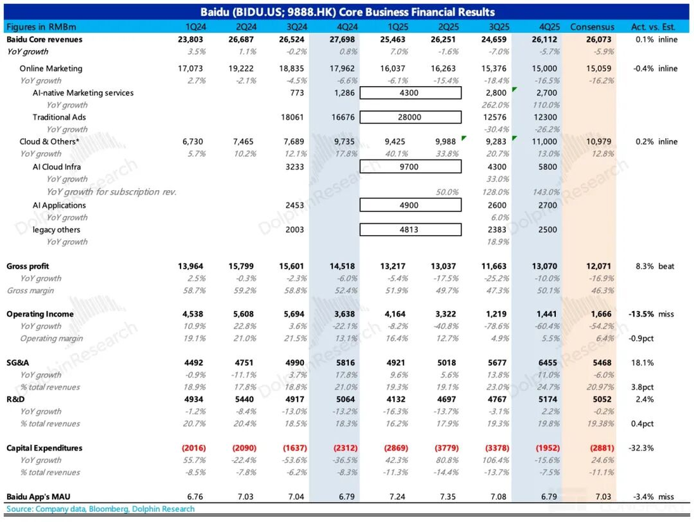 本季度正式采用新架构进行业绩披露,分为AI业务和其他传统业务两部分,AI业务包含AI基础设施、AI应用以及AI原生营销。由于机构还是按照原架构来给预期,因此这次海豚君尽量还原成旧披露方式来进行对比分析,并依旧关注百度部分,不包括爱奇艺。