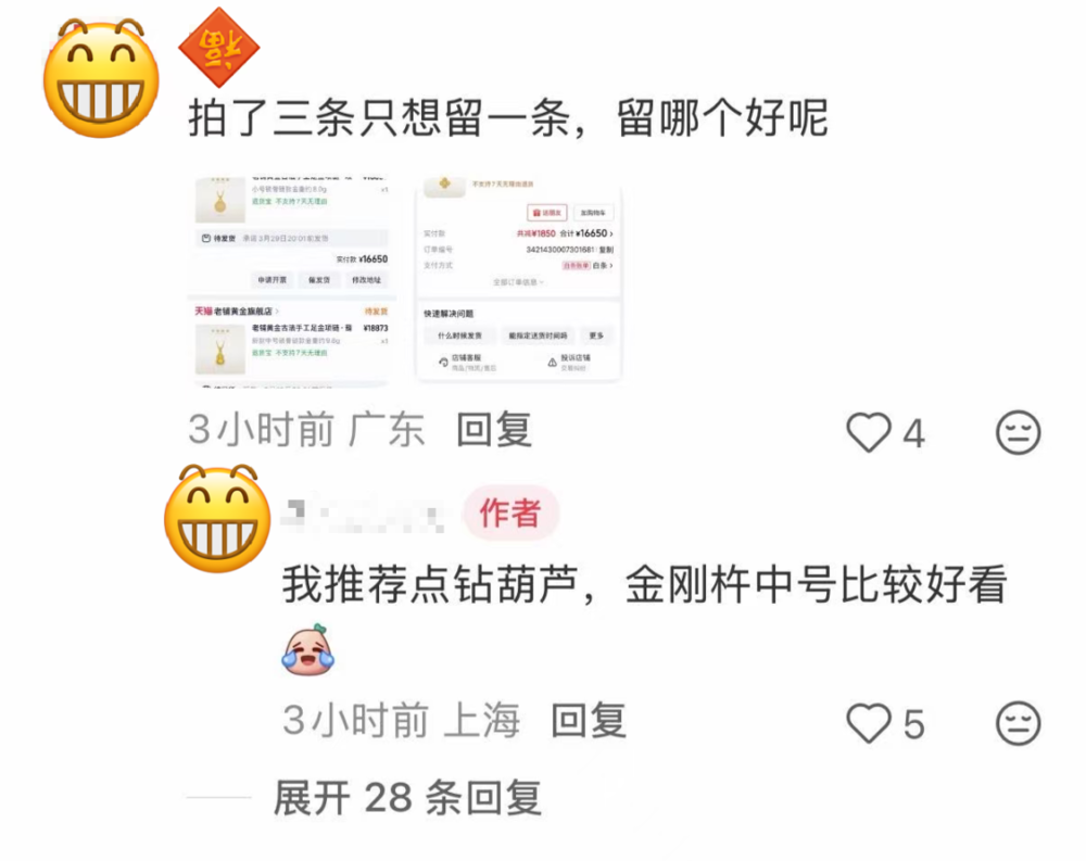 仅是一条点钻葫芦中号肖邦链,在留言区炸开锅,掀起晒图讨论热潮。“像做梦一样,”有网友表示,自己在2023年以1.6万多元拿下,克重在16克以上。另一位网友报料,刚刚在今年2月香港入手了一条,折合汇率算起来在3.2万元左右。经历一夜调价,网友发现这款已跳涨至4字开头了,“基本上就是躺赚七八千了。”