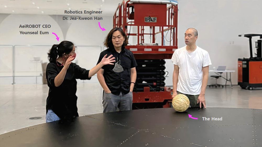为了控制不让“头颅”掉落,MMCA个展开幕前与机器人工程师(中)合作。图片由崔旴嵐提供