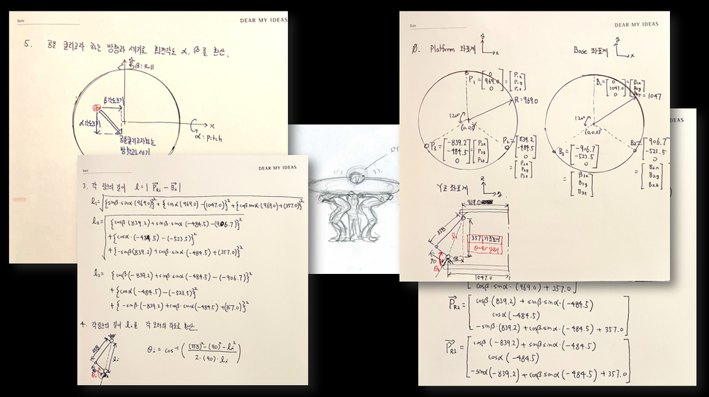 一开始,我们只是尝试控制不让“头颅”掉落,但由于无法计算球体的运动速度与惯性,“头颅”根本没法在圆桌上停留片刻。直到布展时,这个问题仍未解决。幸运的是,在开幕前两周,我们得以与一位机器人工程师合作,他运用动力学公式设计了一套能够预测球体一秒后的位置并据此控制伺服电机的算法与系统。多亏了他,作品才得以在开幕前夜最终完成。