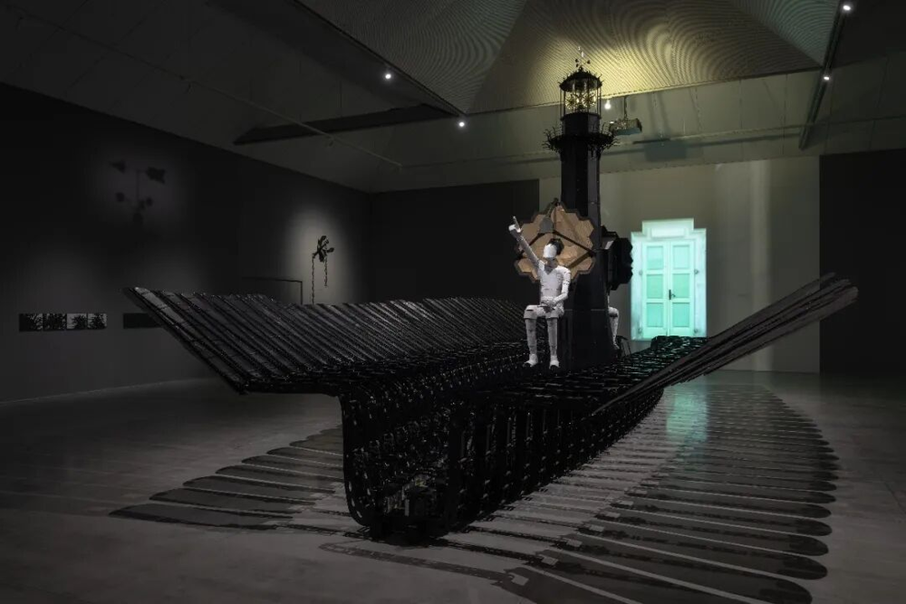 经历了新冠大流行,我自然而然地想到了“方舟”这一意象——不知驶向何方,甚至连该让谁登船都无法确定的、充满不确定性的救赎的象征。这件作品始于“我们究竟该运载什么?该留下什么?”的疑问。在这无法承载所有人的、有限的救赎工具内部产生的选择与排除、歧视与争斗的样态,就如同我们当下所处社会的缩影。从这些思考出发制作而成的方舟,会按照总长20分钟的剧本运行。众多飞翼代表着个体,其运动代表着社会不断重复冲突与和谐的节奏。位于方舟中心的灯塔,象征着我们“所相信并依赖的事物”。对某些人而言,那可能是宗教,可能是父母,也可能是政治领袖。但这座灯塔并非绝对稳固,它随着方舟一同摇晃、漂浮。通过这艘方舟,我试图象征性地呈现个人与社会结构中不断重复的冲突与循环。
