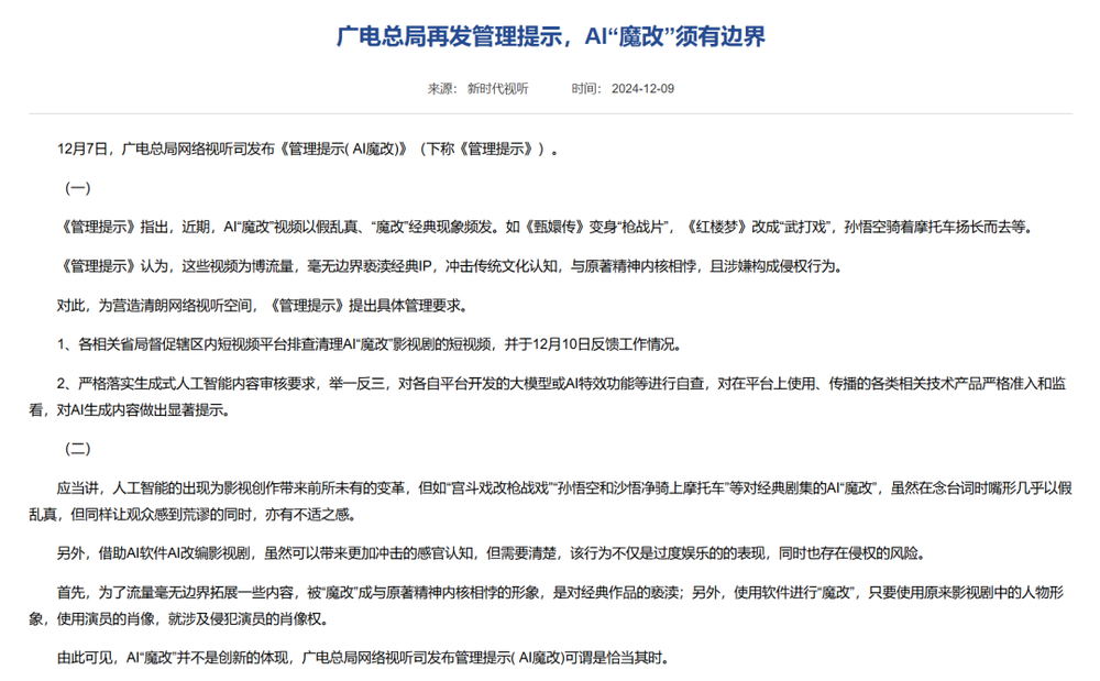 国家广播电视总局曾在2024年12月发布的《管理提示(AI魔改)》中明确要求: