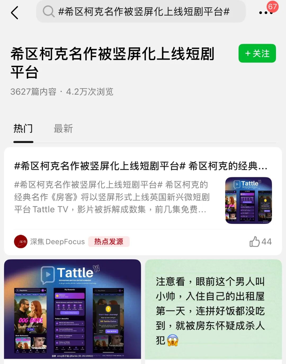 这是电影大师阿尔弗雷德·希区柯克1927年的经典默片《房客》的标志性镜头。1月底,滑进了英国微短剧平台Tattle TV的推荐流。