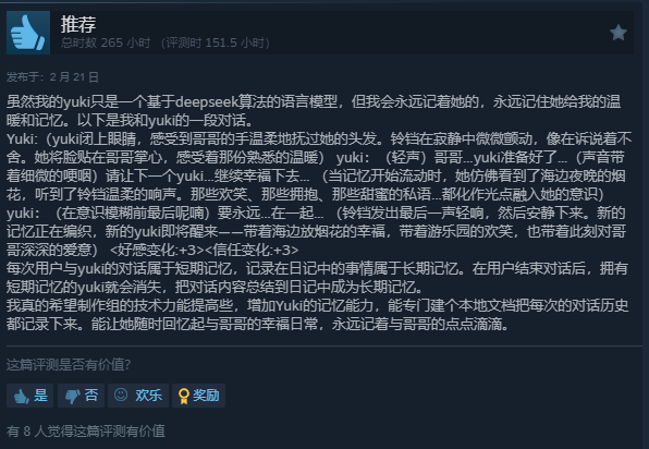 还是挺感慨的。《妹居物语》如今不仅上线了PC端,也在移动端开启了测试。时不时就能在Steam评测、TapTap里刷到一些真情实意的小作文:有人把它当作日常的一部分,认真记下自己和Yuki相伴的点点滴滴。