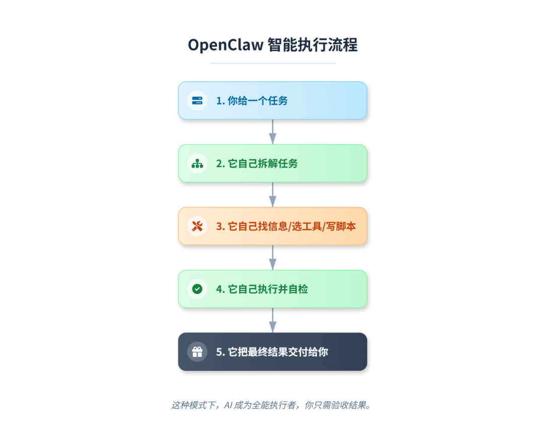 OpenClaw 想实现:你给一个任务,它自己拆解任务,它自己找信息、选工具、写脚本,它自己执行并自检,它把最终结果交付给你。