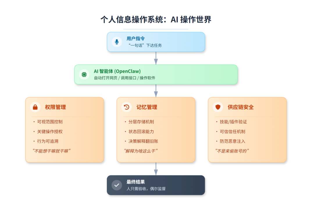 OpenClaw 这类系统让我看到的,是一个新画面:AI 操作世界。你只需要说一句话,AI 在后台自己打开网页、调用接口、操作软件,你面前的屏幕从“必须亲手操作的界面”变成“只看结果、偶尔盯一下”的地方。