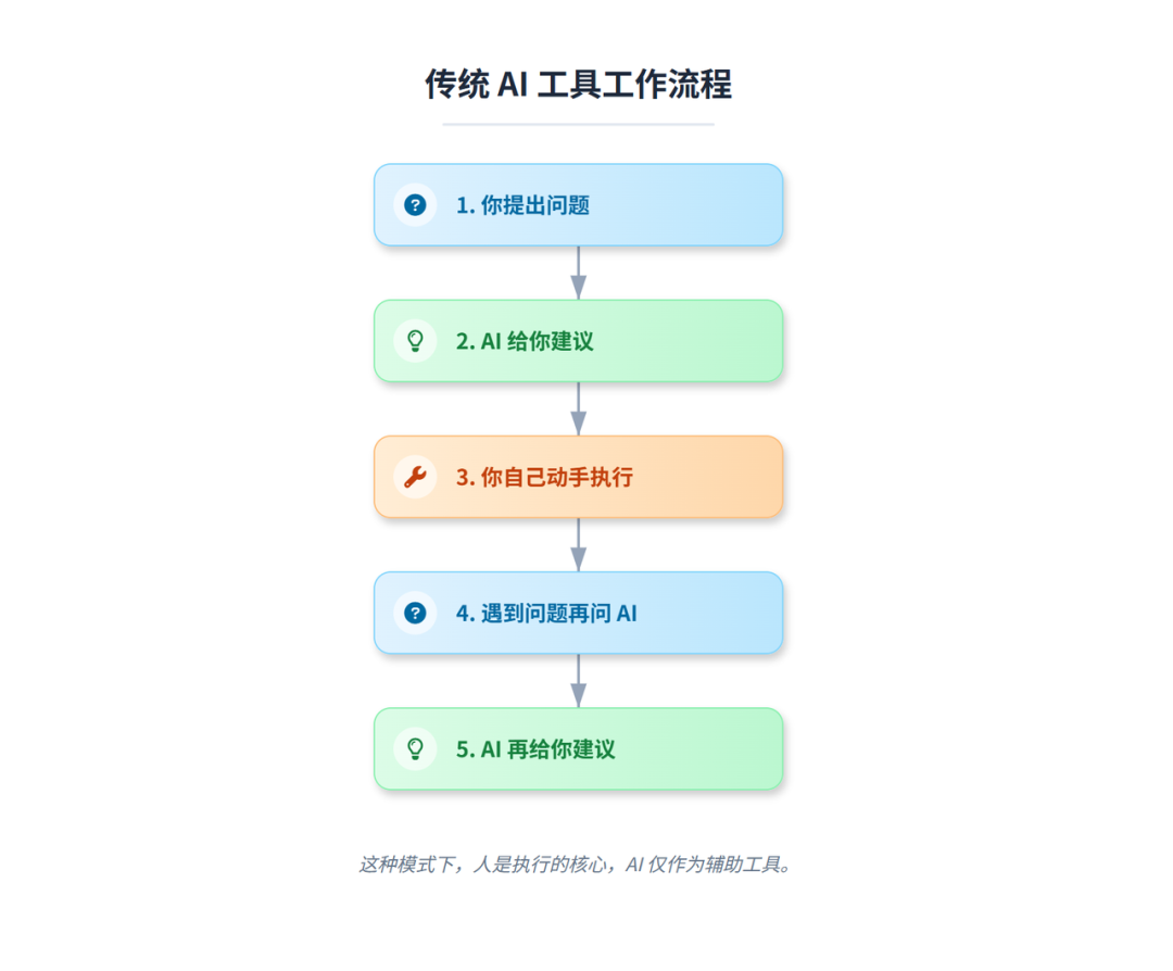 用流程对比最直观。传统 AI 工具:你提出问题,AI 给你建议,你自己动手执行,遇到问题再问 AI,AI 再给你建议,如此循环。