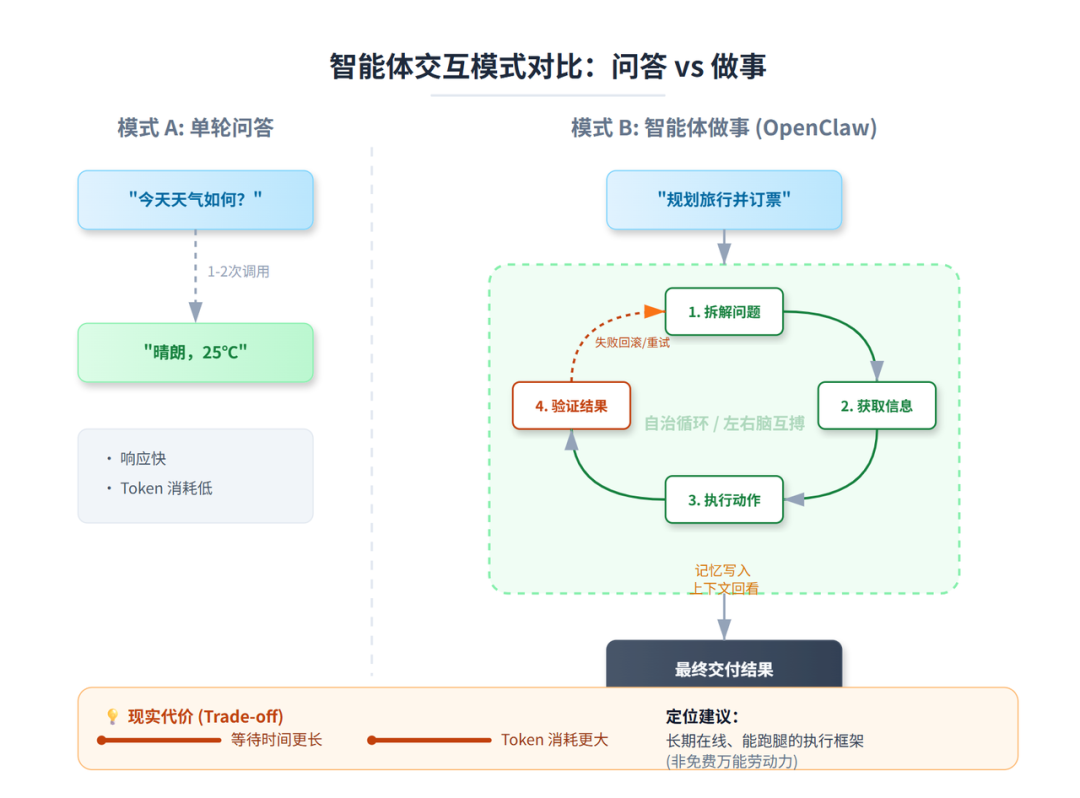 因为做事意味着要拆解问题(这一步就可能来回推演多轮),要获取信息(浏览网页、查 API、读文件),要执行动作(每一步都可能失败),要验证结果(验证失败就要回滚或重试)。