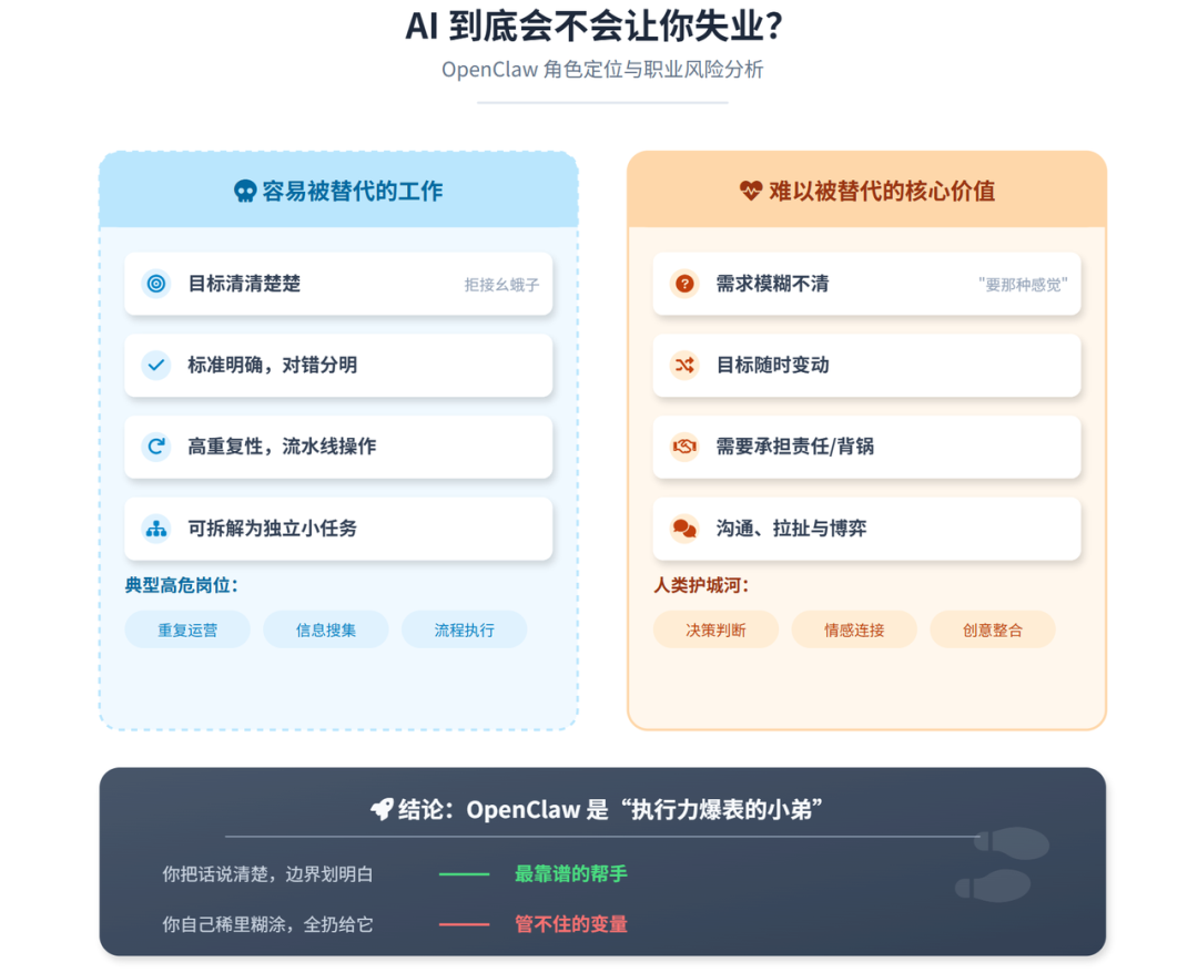 这里一定就有人开始焦虑了:OpenClaw 这么“强”,我会失业吗?