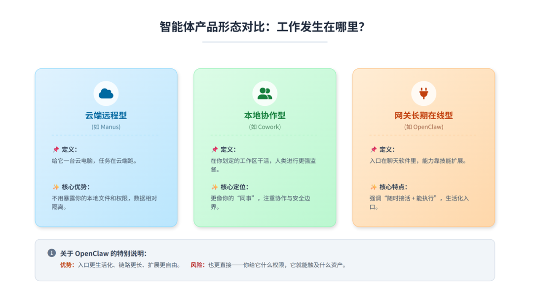 很多人会把 Manus、Cowork、OpenClaw 放在一起比较。这里有一个很好用的区分维度:工作发生在哪里。整理成三类“工作形态”: