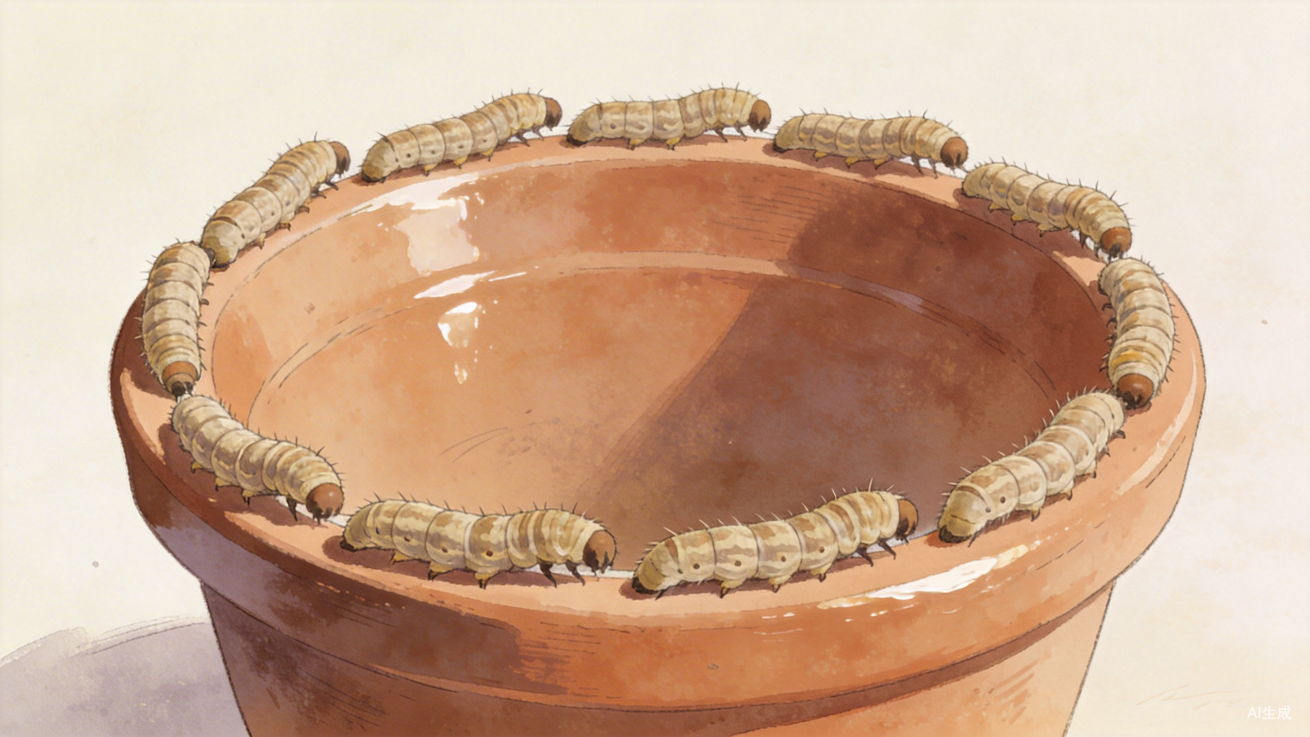 法国昆虫学家法布尔做过一个实验。他发现松毛虫有一种本能:它们在行进时会吐丝,后一只虫子会踩着前一只虫子的丝走,排成一条长长的“队列”。为了测试这种本能的极限,他将一群松毛虫引到一个大花盆的边缘,并设法让领头的松毛虫与排尾的松毛虫相连,形成了一个封闭的圆圈。