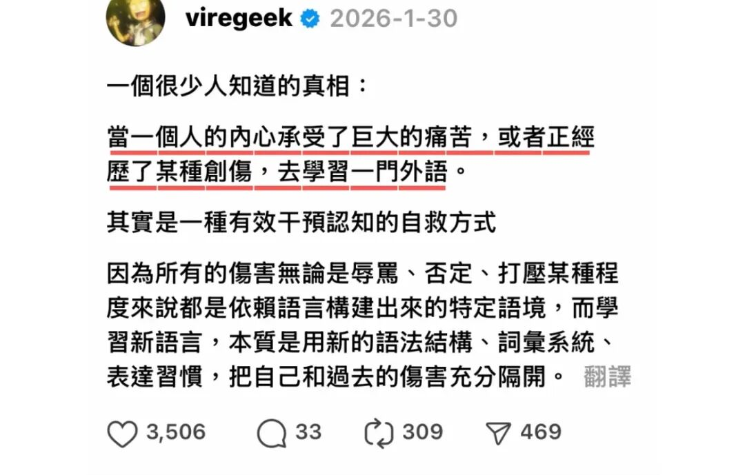 正如维特根斯坦的名言——「语言边界,就是世界边界。」如果母语的世界被创伤占据,那么学习外语就是在原本坍塌的世界之外,强行开垦出一块新的领地。