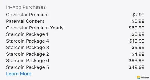 Coverstar的应用内购买项目包含了Starcoins虚拟货币和Coverstar Premium订阅服务。Starcoins价格在0.99-99.99美元之间不等,可以用来为创作者送虚拟礼物、加成视频曝光、解锁额外视觉效果等。这种虚拟货币体系与很多直播平台采用的礼物经济在形式上类似,但在Coverstar的社区生态中,付费行为更多表现为一种鼓励和支持的设定,而非用户消费的主要驱动力。由于目标人群以未成年人为主,家长通常会限制甚至禁止内购行为,这也使得Starcoins体系在实际中并未形成稳定的付费闭环。