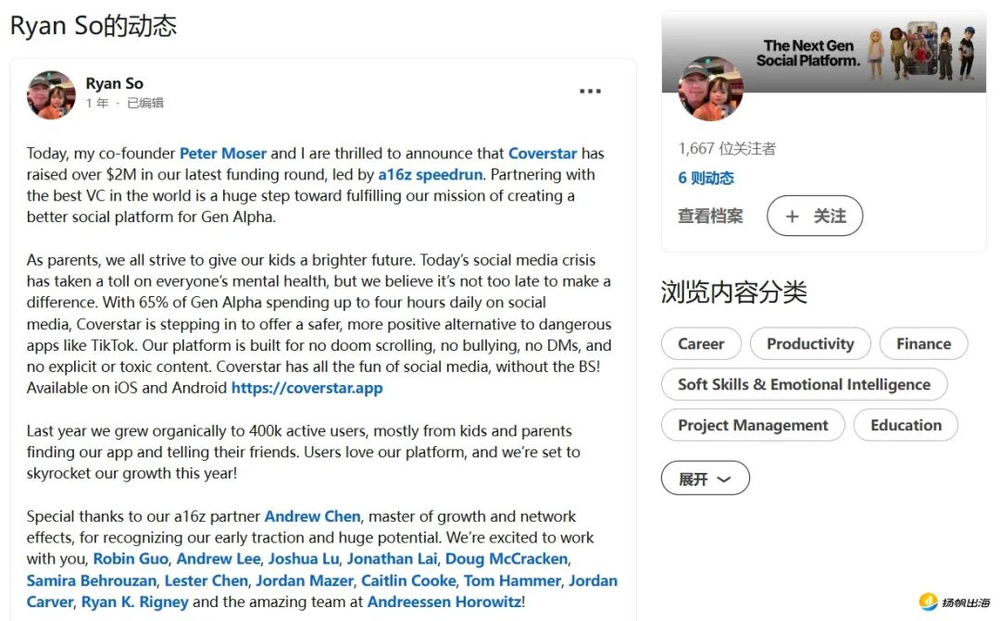 值得注意的是,在2025年,Coverstar首席执行官Ryan So通过LinkedIn发文宣布,Coverstar已获得由a16z Speedrun领投的超过200万美元的新融资。他进一步指出,65%的Alpha世代每天在社交媒体上花费长达四个小时,其目标是“为Alpha世代打造更优质的社交平台”。