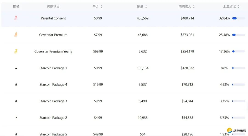 点点数据显示,2025年1月1日至2026年2月27日,Coverstar全球全商店总收入约为165.4万美元,其中,约88.8%收入来自美国。在美国地区的内购项目排名中,0.99美元的“Parental Consent(家长同意)”占比最高。这实际上是一种付费验证方式,当用户在应用内触发需要父母同意的流程时,平台提供一种“快速验证/确认”的选项,父母支付一个小额费用用于确认年龄和同意使用条款,并可能附带绑定家长账户的权限验证机制。