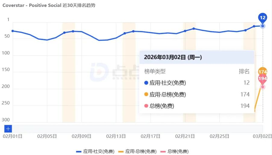当用户长期被束缚于这样的社交规则之下,一类强调内容安全、积极氛围、可控互动的社交产品开始获得他们的注意。点点数据显示,Coverstar上线于2017年,2026年3月2日,其登上了美国App Store社交类免费榜的第12名,并在英国、瑞士、瑞典等多个欧洲国家进入社交类免费榜前十。