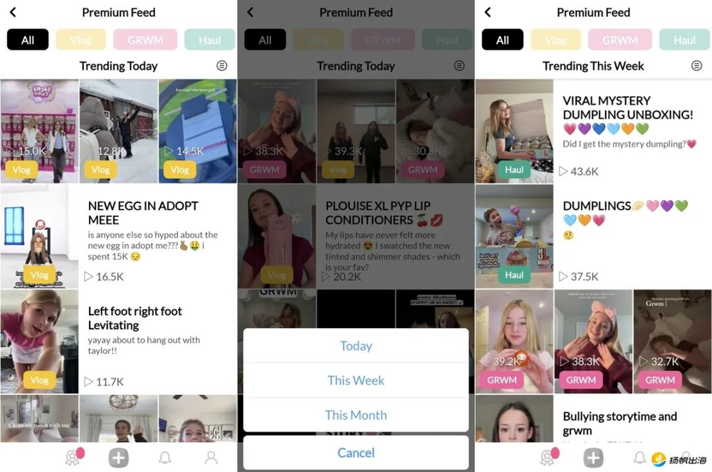 这种设计将用户的注意力从盲目刷内容转向主动创作。对于这些短视频内容,平台还会统计热度和标签分类,用户在首页顶部最上方的入口可以查看当天的流行趋势,甚至还可以看本周、本月的热门内容;根据自己想要关注的分类,还可按Vlog、GRWM、Haul等标签进行筛选。