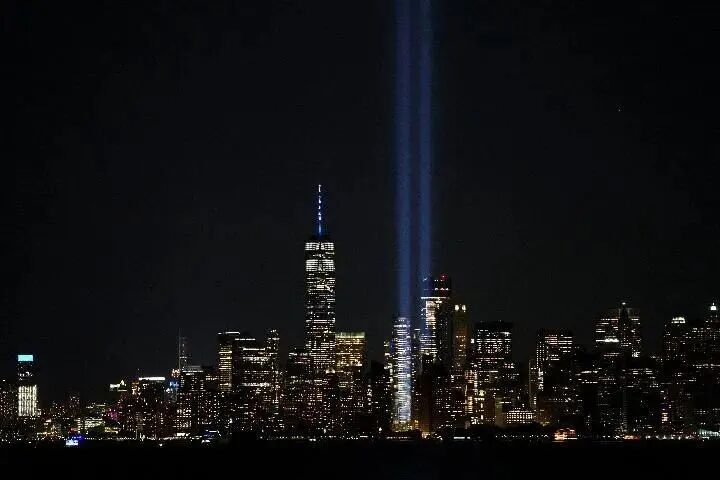 美国纽约世贸中心遗址附近亮起象征纽约世贸中心双子塔”大厦的光柱(图源:新华社)
