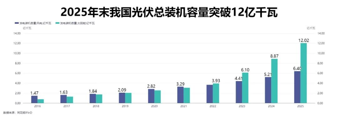 我们看到,近年来,我国风电、光伏等新能源发展得非常快。此前,国家能源局公布了最新的数据,2024年,我国一年新增的风电光伏装机合计3.6亿千瓦,2025年,这一数据达到了4.3亿千瓦。