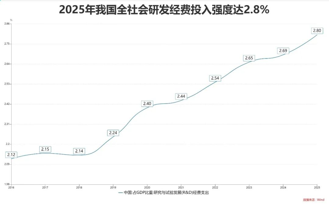 张晓强:这个发力点可以从不同角度来看。首先,要继续多渠道加大科技研发投入力度,特别是基础研究的投入力度,因为科研投入直接关系到产出。欣喜的是,根据国家统计局公布的最新数据,2025年,我国全社会研发经费投入强度达到2.8%,首次超过了OECD(经济合作与发展组织)国家平均水平。