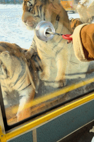在哈尔滨东北虎林园,想投喂老虎的游客可以乘坐“惊险车”。园区里13处散放投喂区,车停在老虎周围后,通过车上的孔洞把肉条递给老虎。